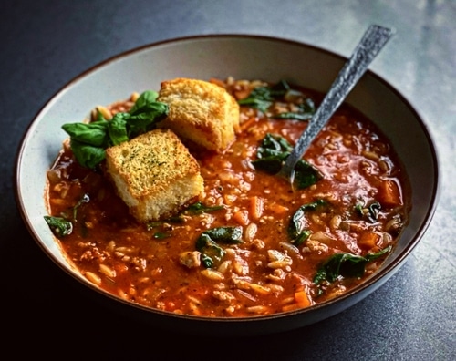 After about 10mins the orzo should be just cooked, now add in the spinach, stir and cook for another 2 minutes until it has wilted in the soup. Have a quick taste and add more salt and pepper if you require.