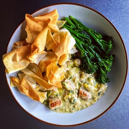 I've seen so many gorgeous filo topped pies doing the rounds on the internet and always thought, I must try that... and so I have!! I have to say it's incredible.. Lighter then normal pastry, it fills you up just the same as a normal pie but without having to have a nap after. My filling is a delicious chicken sausage, leek and tarragon, you can swap out the chicken sausages for chicken breast and still have a yummy pie, check the tips at the bottom for cooking instructions.
