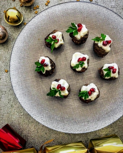 Light up your friends and families faces with these super cute Xmas canapés. They look like sweet mini Christmas puddings but in reality they are savoury kofta meatballs. Each mouthful gives a punch of Middle Eastern flavour that will impress all your party guests.