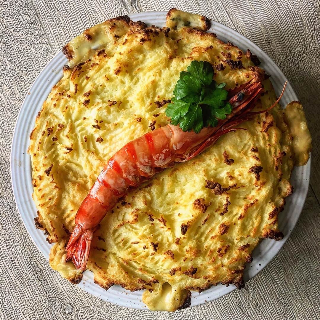 Warm your cockles on a miserable day with my ultimate comfort dish. There is something quite special about a delicious fish pie and this recipe shows you just how to ramp it up a level without using any difficult techniques, of course please buy which ever fish suits your budget but to make this extra special I used beautiful fresh fillets of salmon and smoked haddock and threw in some large plump Argentinian red shrimp.. and lets not forget the massive prawn on top but that's just an extra treat, its what's inside that counts.